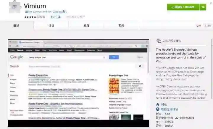 Vimium 这个名字其实是 Vim 和 Chromium 的合体。可能很多童鞋已经猜到她是干嘛的了,她继承了 Vim 的常用操作,完全脱离鼠标来控制浏览器,是一款黑客级别的 Chrome 插件。对熟悉 linux 的同学来说,简直是神器。