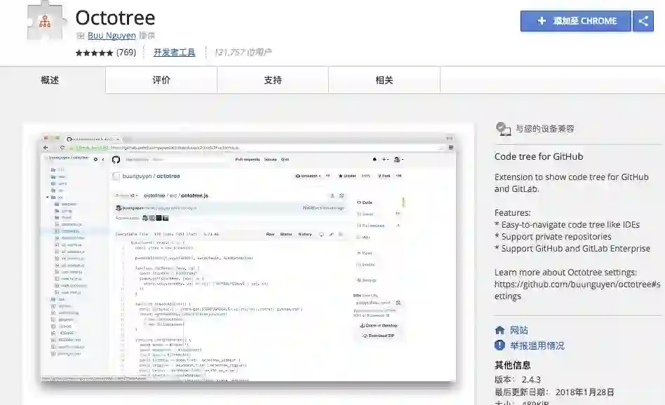 GitHub 上查看代码的时候总是一层层进入再出来,有点麻烦,没关系,有 Octotree。安装 Octotree 之后,浏览托管在 GitHub 上的项目,可看到左侧的树形结构,更方便查看代码。