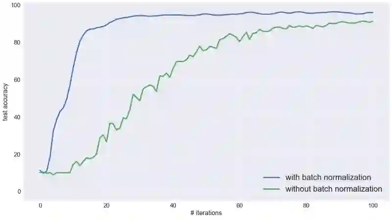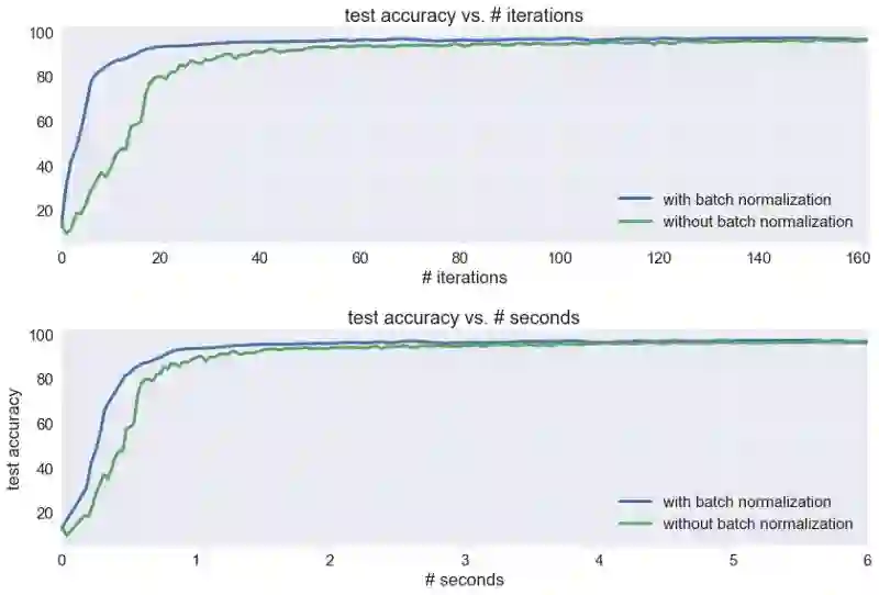 对于MNIST分类问题(使用1080 GTX GPU),批量标准化能在较少的迭代次数收敛,但每次迭代的时间较慢。 最终,批量标准化版本的收敛速度仍然较快,但整合训练时间后,改进效果并不明显。
