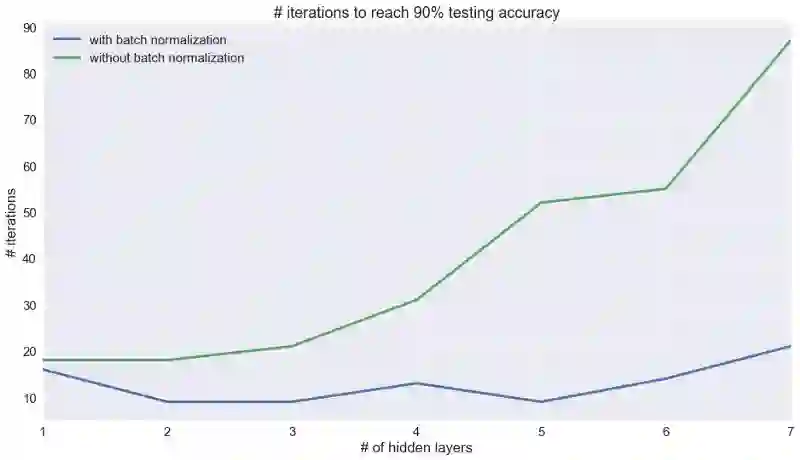 如果没有批量标准化,达到90%准确度所需的训练迭代次数会随着层数的增加而增加,这可能是由于梯度消失造成的。