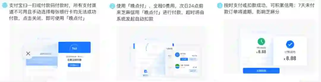 您可在通过芝麻信用评估的情况下,开通晚点付服务,以便您在购买商品或服务时,若付款没有成功,也能顺利获得相关商品或服务。