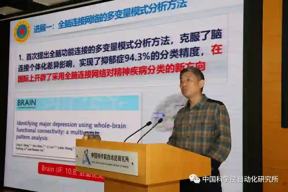 国防科技大学胡德文教授做题为“脑功能的模式识别”的主题报告。报告首先介绍了如何使用全脑模式识别研究精神分裂症、网络成瘾、海洛因成瘾等疾病,以及在这些领域所取得的超越传统方法的最新发现,然后他介绍了全脑链接网络的多变量模式分析方法和多模态脑影像好的特征提取与分类方法的最新研究成果。