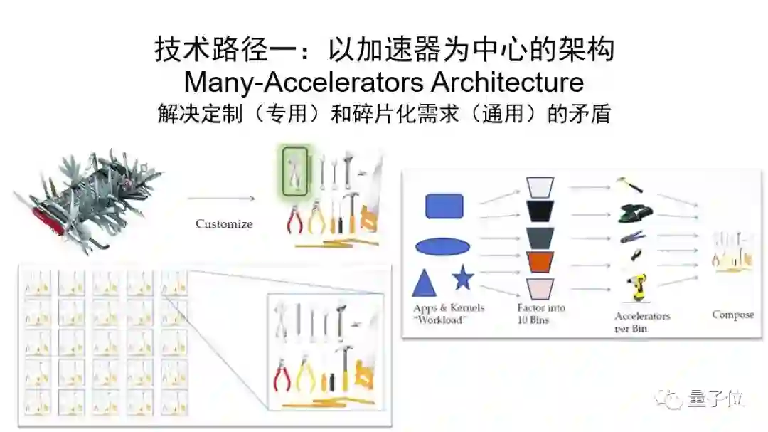 我们做法其实就是把两者做结合,就是我们自己把它叫做以加速器为中心的这样一个体系结构,或者叫many accelerator,就是很多加速器。大概意思就是说以前你不是CPU,是一个瑞士军刀,太大太复杂,特别不便携,现在我把这些东西全部拆起来拆下来,拆成一个的小的工具箱,每个工具箱可能针对一个特定的任务去做一些这种加速的这样一个任务。