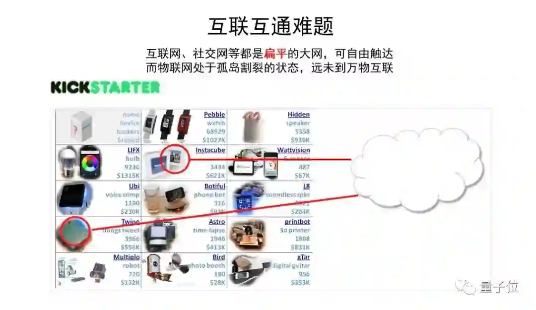 第三个我们觉得叫互联互通的难题。互联互通这个事其实大家说了很久了,大家其实是想把所有东西都连起来,但是实际上你会发现现在大家很难连。比如说我截了这个图(上图),这是比较老的一个图,是美国的一个众筹网站叫KickStarter,上面有很多创客,还有爱好者,他们做了很多硬件产品,但是哪怕这个东西全都放在KickStarter上,这些设备之间几乎没有任何连接,就是他们这些设备之间没有任何的关系,所以完全都是一个个孤立的设备。