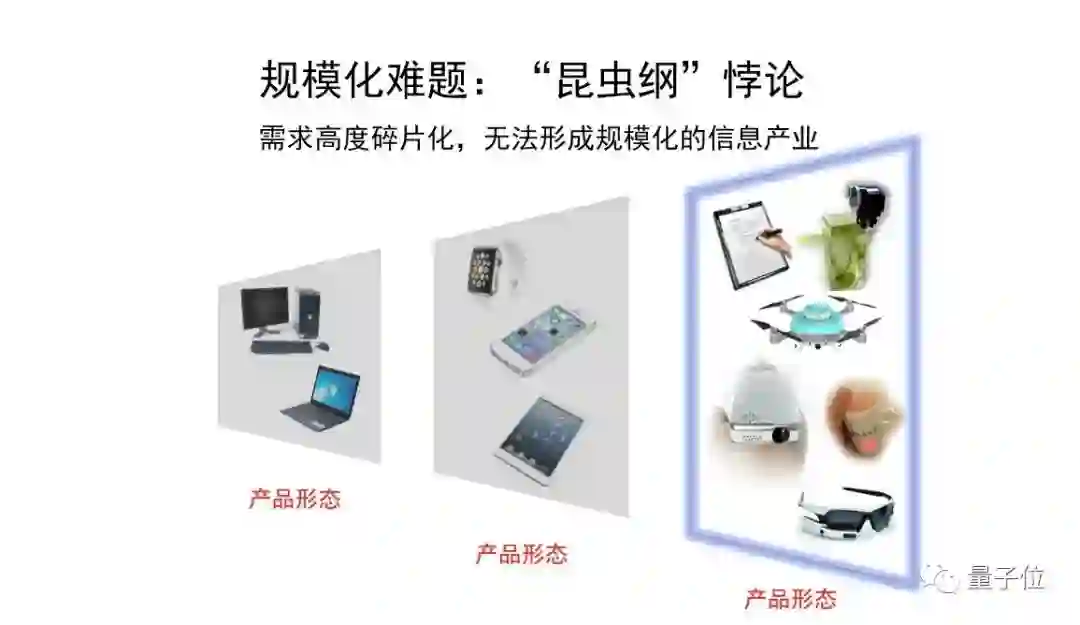 硬件或者产品形态存在高度的碎片化。碎片化就表示种类多,生态很繁荣,但是对于我们信息产业,或者对于我们做这些基础设施的人来讲,是一个比较大的挑战,因为做信息基础设施它是要求规模化、标准化、可复制,如果每一个品类的数量不大,但是它的需求特别细分、特别垂直的话,我们没有办法提供一个非常通用的基础平台。如果不能提供这种平台的话,成本就一直降不下去,不利于整个行业的这种规模化的发展。