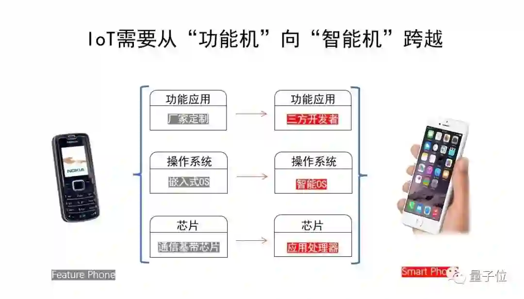 在深入介绍之前,让我们一起回顾,功能手机发展到智能手机,在技术上是怎么样跨越的。现在物联网的时代,就跟我们当年的功能机时代,诺基亚和摩托罗拉手机的时代,非常像。功能机的芯片都是一种通讯类的芯片,你看现在所有IoT的设备,上面用的芯片基本上都是WiFi或者是蓝牙芯片,都是一种通讯类的芯片。操作系统方面,当年诺基亚手机的操作性就很差,因为完全是给手机定制,而不是开放的,是一种嵌入式的操作系统。功能机比如诺基亚手机上的软件,完全是厂家自己定制的,没有任何第三方能够给它扩展功能。但是到了智能手机时代就完全不一样了,智能手机首先加了应用处理器,就让手机从通讯设备,变成了计算设备;手机上还安装了智能操作系统,不管是iOS或者是安卓,都是非常开放的智能操作系统,它的好处就是让智能手机就不再像我们的功能机一样,可以让第三方给它去装应用,也就是说手机的功能它不再是由做手机的人来定了,而是由这些写软件的人来定义。