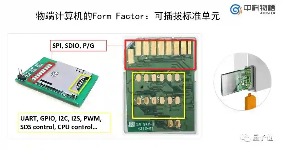 我们做法就是把共性的部分标准化,中科物栖的物端超微计算机,把CPU、WIFI/蓝牙、内存/闪存集成到一个大概有SD卡大小的一个卡片的小机器上。那些不确定的I/O部分是怎么处理的呢?它背后有很多的PIN脚,可以插拔到一个卡片卡槽里头,然后带卡槽的扩展板就可以去控制各种各样的I/O。