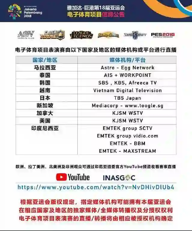 而前不久,雅加达亚运会官方公布了这次电竞项目直播的渠道信息,而其中并没有提到在中国大陆地区,甚至上面提到的决赛,官方也并且有明确的信息表示一定会播。