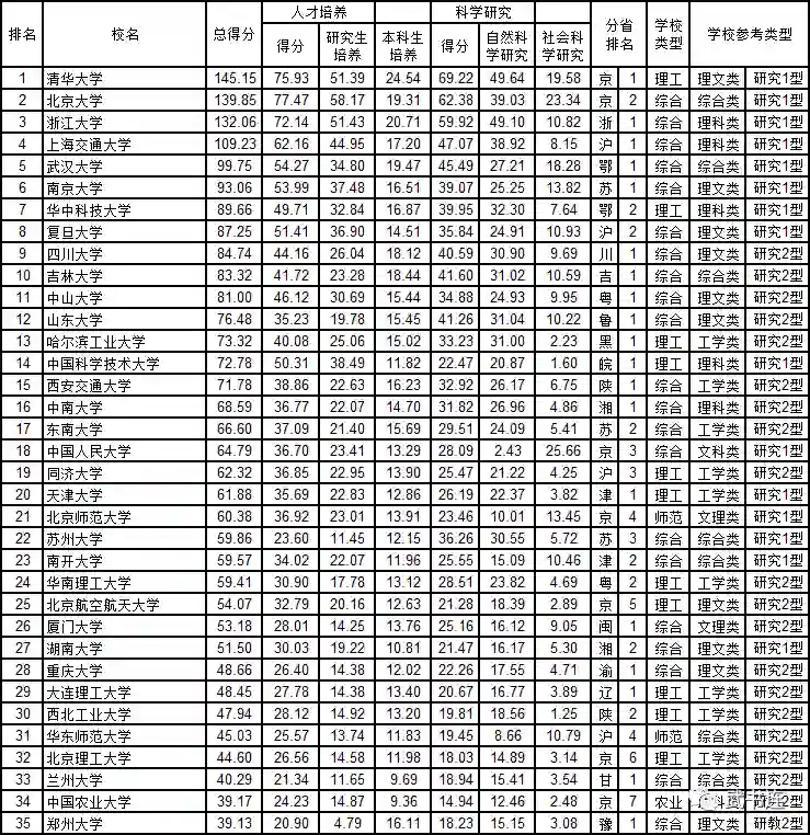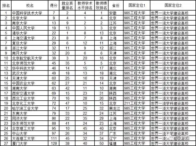 武书连2020中国一流大学名单(共27所),得分越低排名越前。