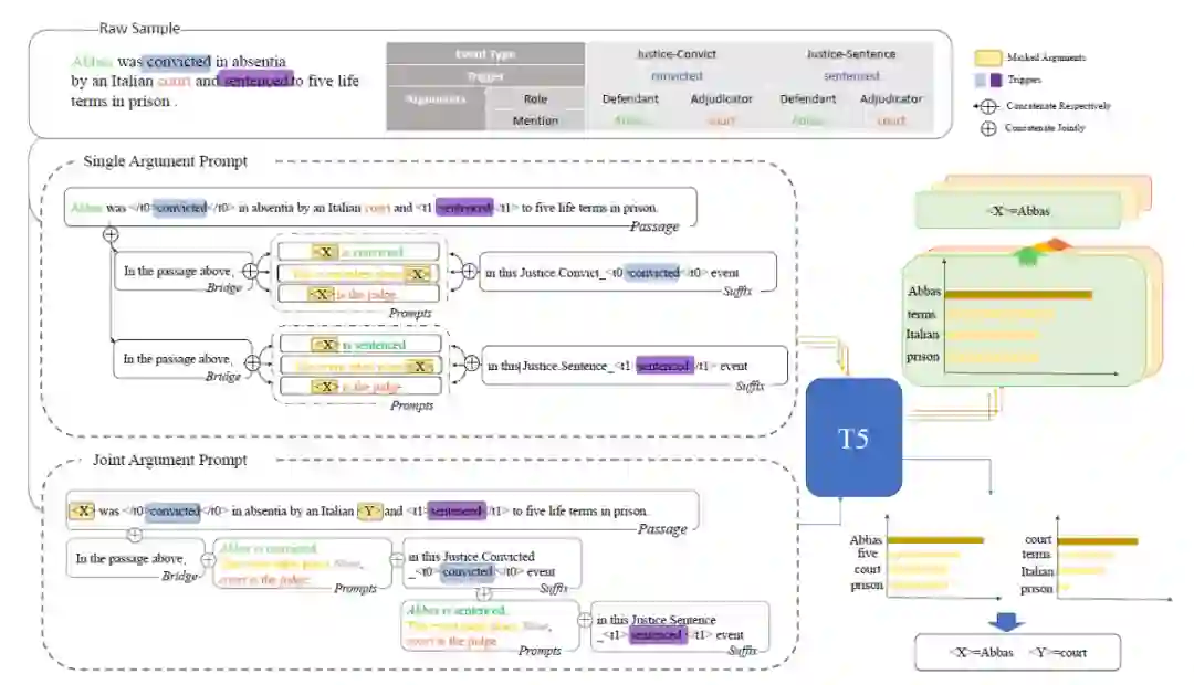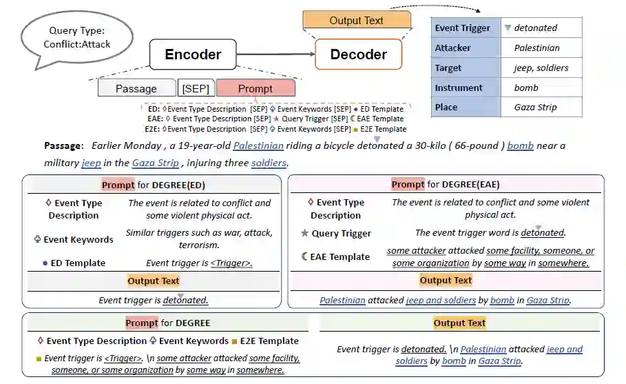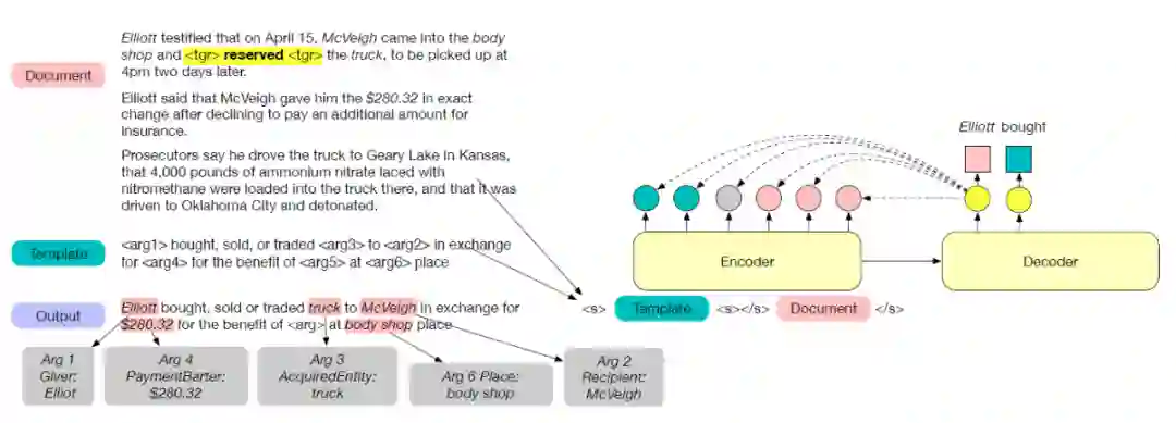 该工作 [11] 也是类似的做法,是采用生成式的方法利用 Prompt 去生成预定义的模板。这样做可以融入标签的知识,而且还是一种端到端的设计,模型能够捕捉到触发词与论元之间的依赖。模型如下图所示:整体的思路是给定模型 passage 和事件类型,然后将 passage 和对应的 prompt 拼接到一起,然后模型按照模板生成,最后从生成的模板中解析事件。