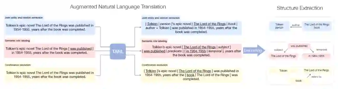 基于此,作者提出了 TANL 模型(Translation between Augmented Natural Language),即给定输入,输出原有文本和对应的文本标注。如下图所示,输入文本,输出的文本在原文本的上做了 augmented,即加上了标注,图中的实体关系联合抽取任务,会在头实体上加上对应的实体类别,在尾实体上除了加上实体类型,还会加上关系,以及对应的头实体 span;语义角色标注任务,模型会标注出主语,谓语,时间地点等;共指消解任务,模型会标注出所有的第一个 mention,然后在后续出现的 mention 上标注对应的本体,最后对输出的文本进行解析,得到预测的结构。