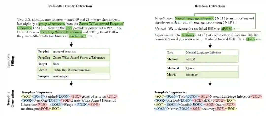 任务形式如下图所示:针对 REE 任务,使用预先定义的模板,<SOT> 和 <EOT> 表示模板的开始和结束,<SOSN> 和 <EOSN> 表示 slot name 的开始和结束,<SOE> 和 <EOE> 表示实体的开始和结束;针对关系抽取任务,同样使用以上类似的模板。