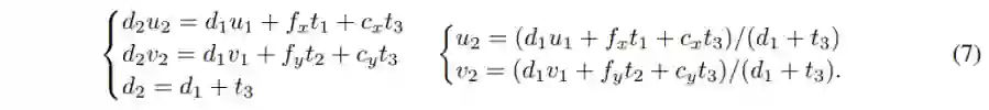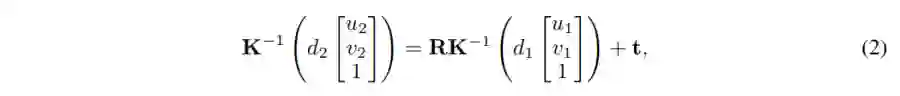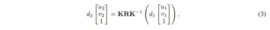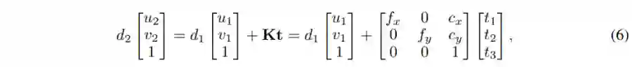 这里,K是一个3×3的相机参数矩阵,R是3×3的旋转旋转,t是3×1的平移向量,d1, d2分别代表这个点在两张图像上的深度。也就是说当我们知道(u1,v2, d1), K, R, t,就可以计算出(u2, v2, d2)。这说明了在完整投影过程中,图像深度与相机运动共同影响了投影结果。