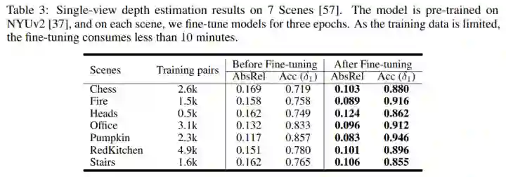 5.为了证明算法的通用性,也在7Scenes数据集上做了通用性测试和finetune (对7scenes数据集也进行了本文的预处理)。结果如下: