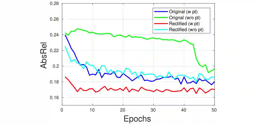 (b)由于投影是训练过程中的关键,我们希望投影误差 (warping error) 能够对深度误差 (depth error) 比较敏感。因此我们根据GT手动生成一些错误的depths然后分析这些错误的depths所造成的warping errors。图2b的结果反应了在NYUv2 上当AbsRel=1.0 (错了1倍,严重错误) 时, warping error ~= 3px。而在KITTI上,warping error ~= 15px。这就导致了在NYUv2上投影误差很难有效区分精确与不精确的深度估计。这是由于在NYUv2上的相机平移过小,从而深度变化只能引起较小的投影位置变化。