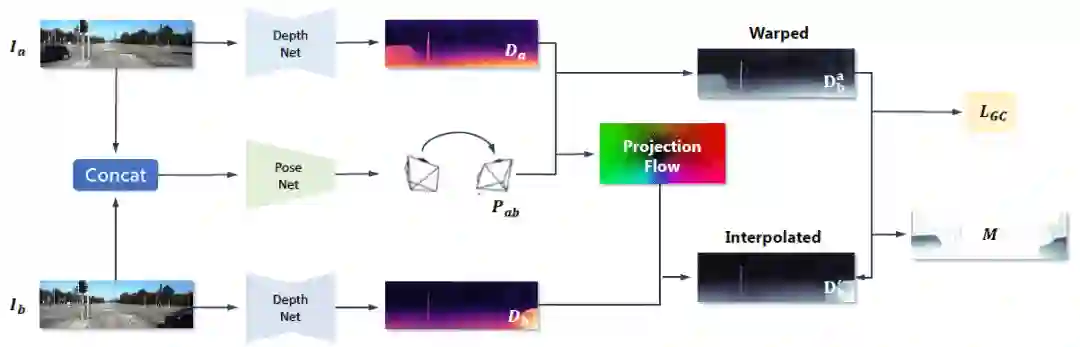 3.基于[2], SC-SfMLearner [4] 提出geometry consistency loss来约束在视频前后帧上所估计出深度的一致性,然后利用这个几何一致性来检测运动物体和遮挡区域。在计算photometric loss时移除这些病态区域,可以提升算法性能。而且用这种训练方式得到的深度估计结果具有在长视频上的尺度一致性,可以用来做SLAM / VO等任务。框架如下: