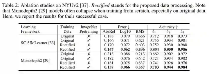 2.Ablation study 结果如下。可以看到 monodepth2 [3] 在处理后的数据上也能取得不错的结果,虽然SC-SfMLearner [4] 更好一点: