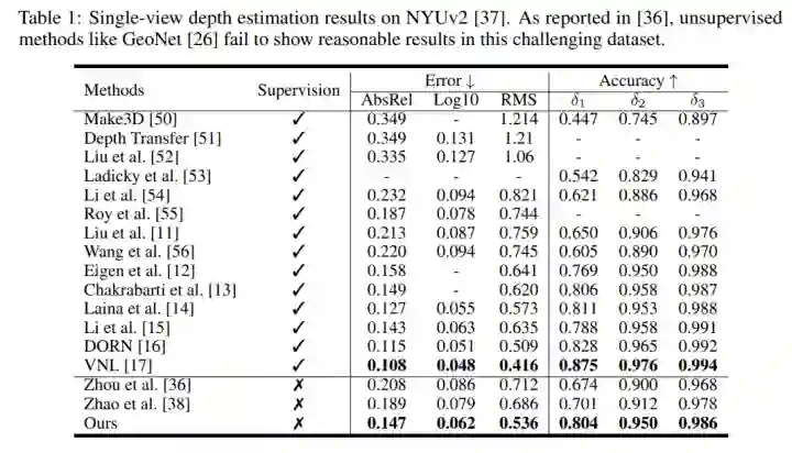 1.本文用SC-SfMLearner [4] 作为训练框架,其中Depth CNN和Pose CNN都使用ResNet18 作为encoder。在NYUv2上的结果如下, 其中 [36] 和[38] 分别是本文提到的 [5] [6]。