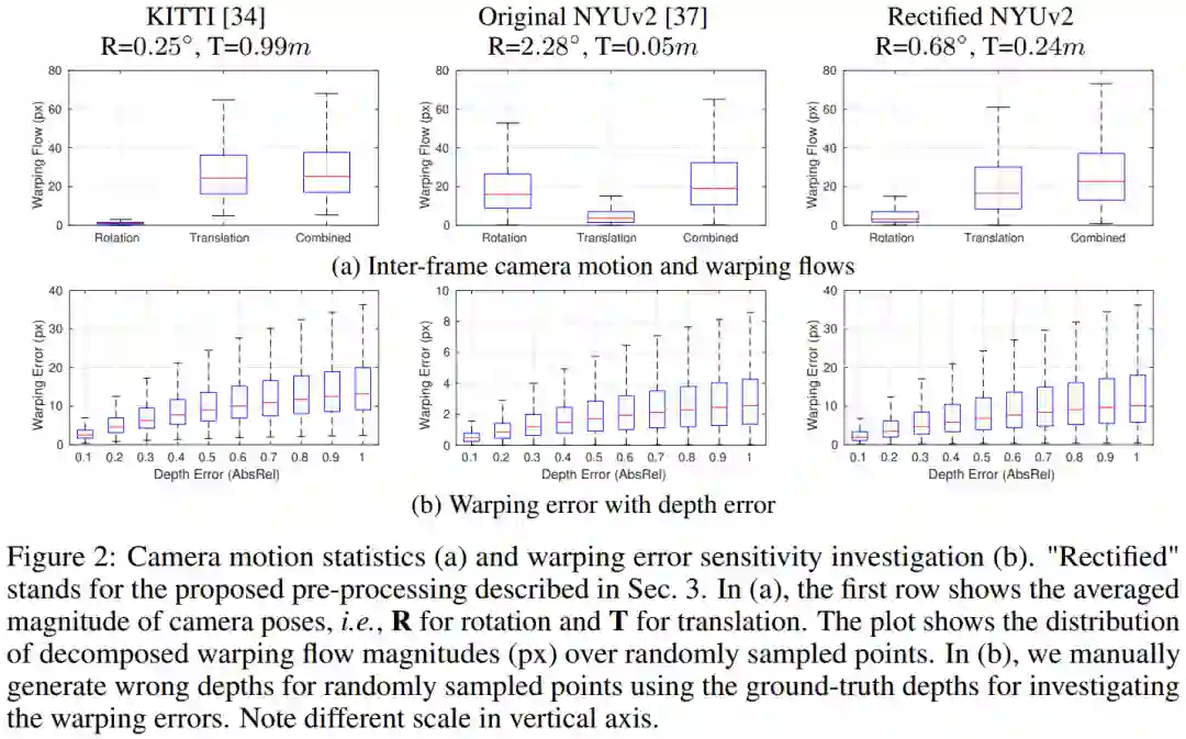 (a)对比视频前后帧相机运动的绝对大小(图2a),我们发现在NYUv2上相机的平均旋转 (R=2.28度) 远大于在KITTI上 (R=0.25度)。而在NYUv2上平均平移(T=0.05米) 远小于在KITTI上 (T=0.99米)。根据之间的结论:旋转是噪音,平移是信号。这就说明了为什么无监督算法在KITTI上运行良好,而在NYUv2上难以训练。另外,旋转和平移分别在图像平面上造成的warping flow的大小 (图2a) 也证明了相同的结论。