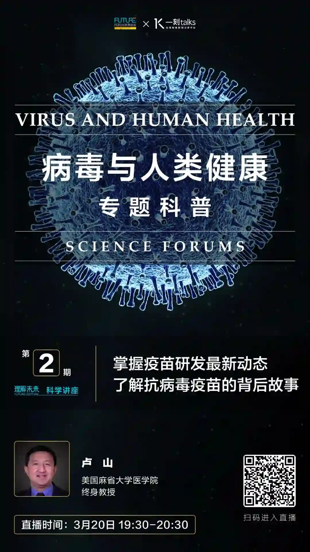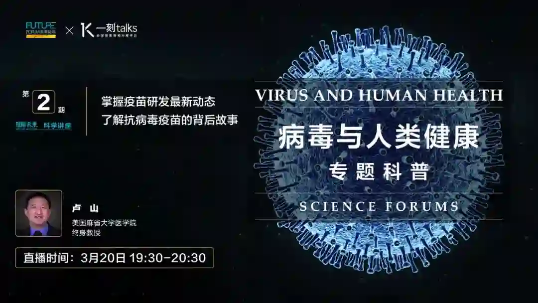 在今晚(3月20日19:30),美国麻省大学医学院卢山教授将为我们带来《掌握疫苗研发最新动态,了解抗病毒疫苗的背后故事》的主题分享。