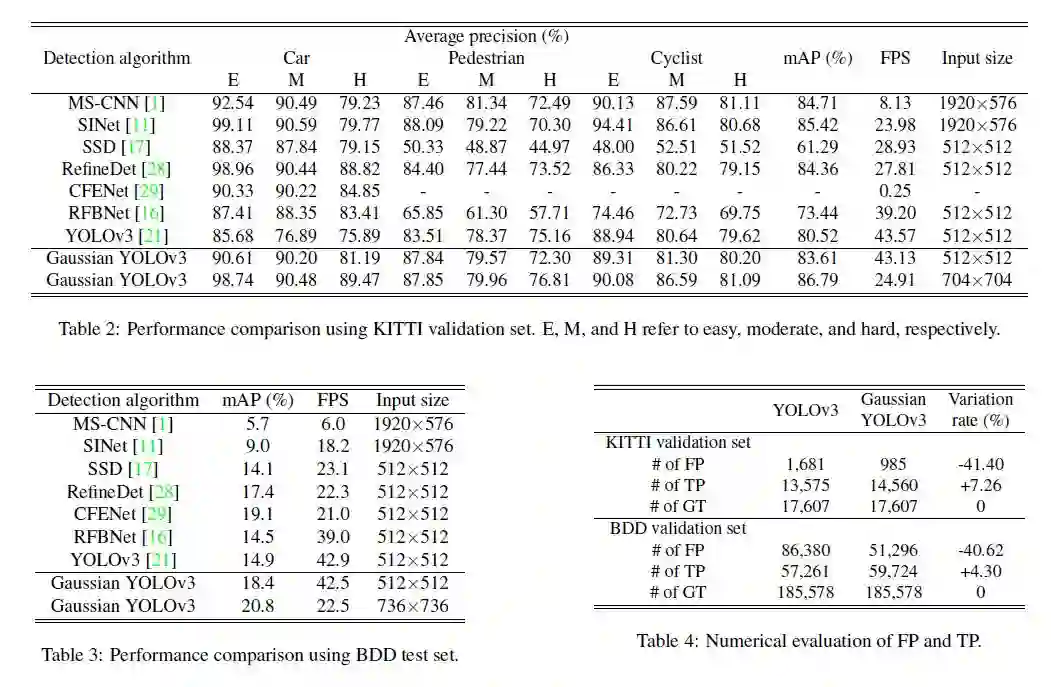 如图所示,Gaussian YOLOv3通过增加网络的输出,和改进网络的损失函数,实现了对预测框可靠性的输出。