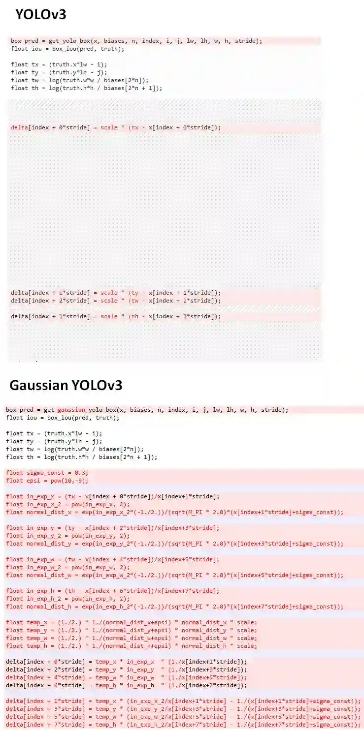 由于Gaussian YOLOv3的输出进行了调整,与之对应的损失函数的计算也会做相应的调整。与原始的YOLOv3相比,仅仅调整了预测框坐标位置的回归策略。如下代码对比所示,原始的YOLOv3进行box回归时,由于网络预测输出就是坐标本身,因此计算梯度时就利用了均方误差的方式。而由于Gaussian YOLOv3输出的是均值和方差,因此在计算梯度时就结合了高斯分布的策略。