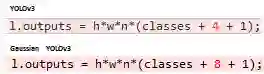 下图为源代码对比,从中我们可以看出,与原始的YOLOv3在坐标预测时输出4个维度不同,Gaussian YOLOv3在bounding box的坐标预测输出中包含了8个维度。