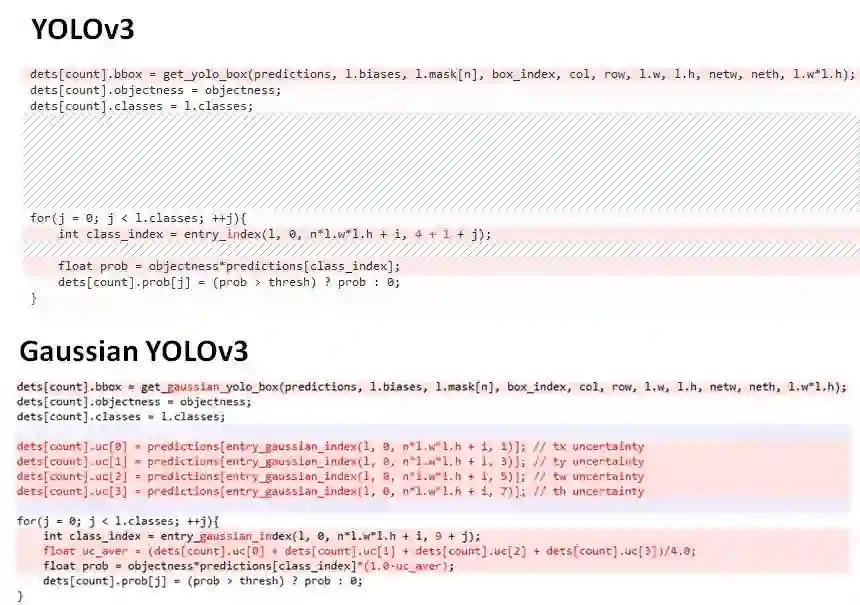 这八个维度相当于是预测框中心坐标和长宽,以及对应预测框的不确定性。作者将这些指建模为四个高斯分布,目标框的位置作为高斯分布的均值,对应的不确定性作为方差。如下图的比对代码所示,Gaussian YOLOv3通过预测每个坐标位置的不确定性,从而提升最终预测prob值的精确性。