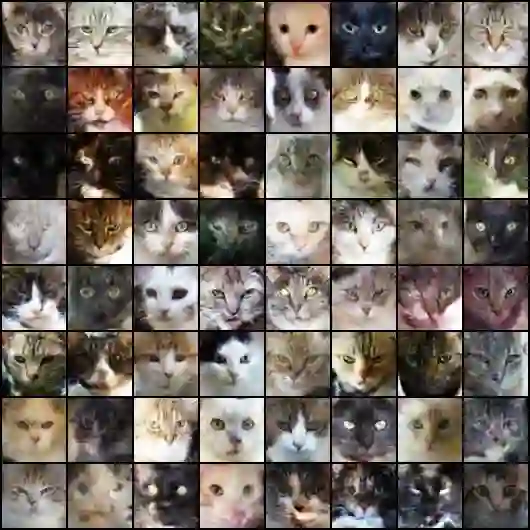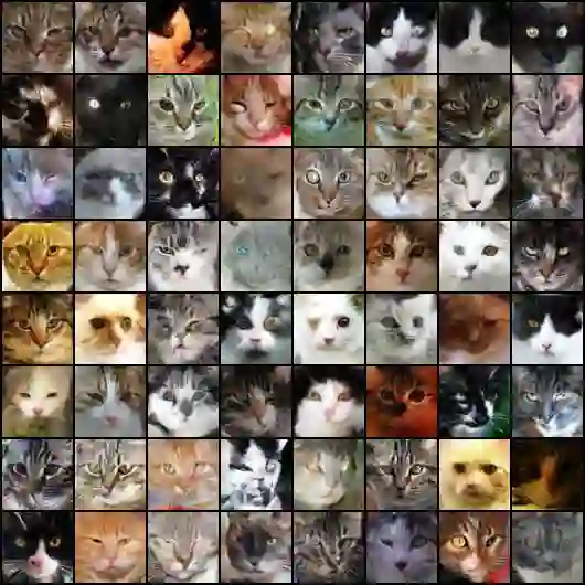 生成的猫非常多样化,而且没有明显的 mode collapse,这是相对 WGAN 的一个重大改进。但是,生成猫的外观非常模糊,就像高分辨率图片被变成低分辨率了一样,我不知道这是什么原因。可能是 Wasserstein loss 的特点。我想使用不同的学习率和架构可能有所帮助。这需要进一步的尝试,肯定还有很大的潜力。