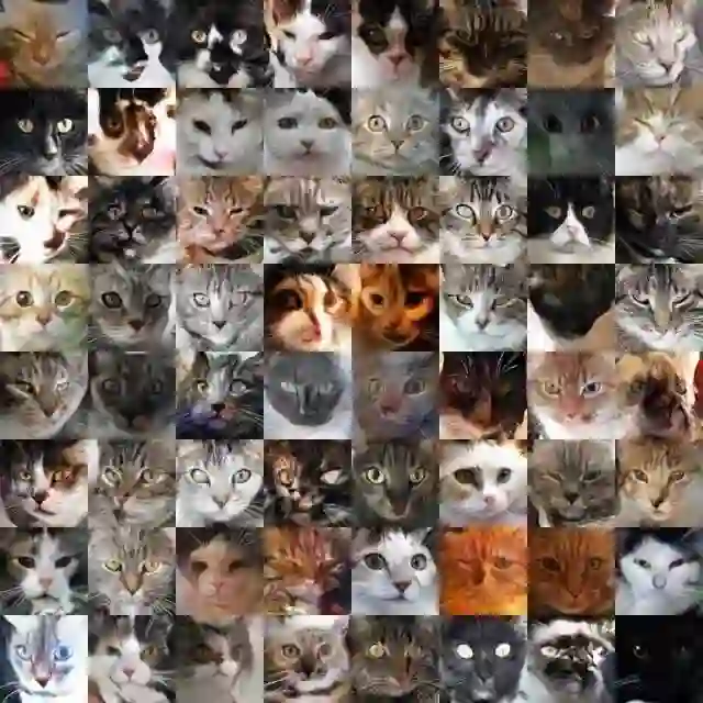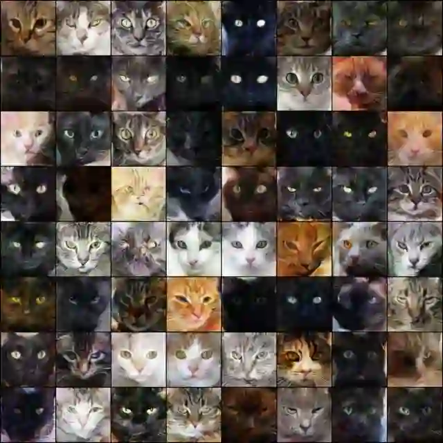 背景:我尝试使用几种对抗生成网络(GAN)来生成猫咪图,其中包括 DCGAN、WGAN 和 WGAN-GP,以及低和高分辨率。训练模型则使用 CAT 数据集(没有,却是有这么个东西)。这一数据集包含 10000 余张猫的图片。在训练前,我们必须让图片集中于正面猫脸,剔除数据集中其他方向的图片(作者是手动挑选的,这花了好几个小时...)。最后,用于训练的图片为 9304 张大于 64×64 像素的图片,以及 6445 张大于 128×128 的图片。