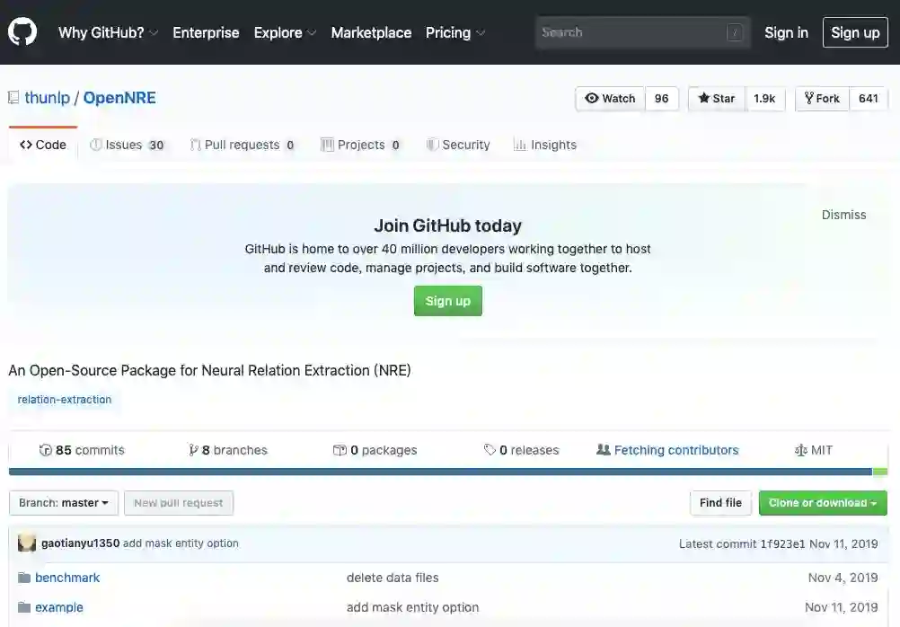 答辩现场,推荐老师提到高天宇「更想做一些有开创性的工作」。高天宇在 GitHub 上贡献了多个高星标项目,其中星标数量最多的是开源项目神经网络关系抽取工具包 OpenNRE,该项目在 GitHub 上获得星标数量超过 1900 个,高天宇在这个项目中是主要力量。