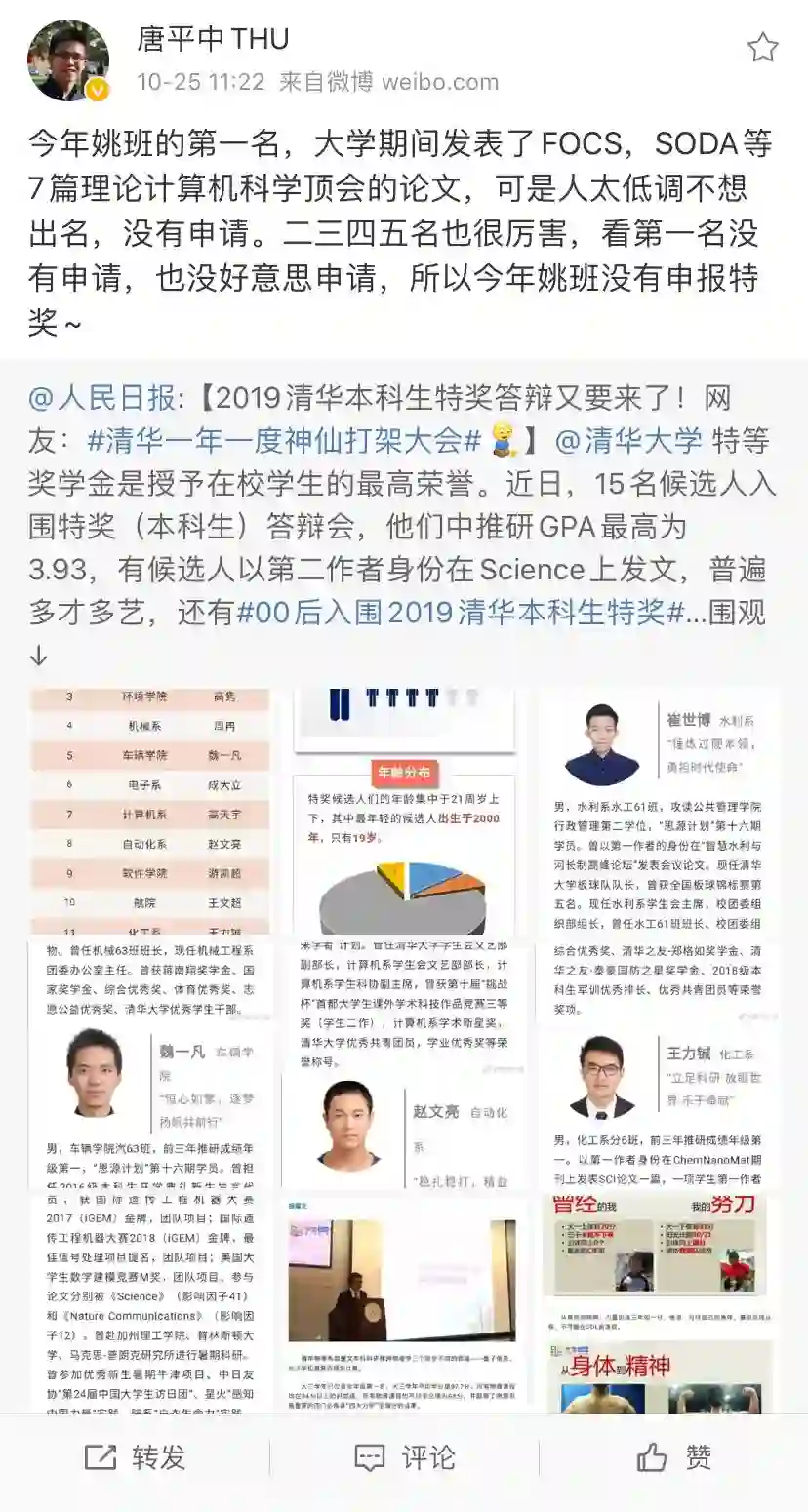 清华大学交叉信息研究院教师唐平中在微博上透露,今年姚班同学均未申请本科生特奖评选。