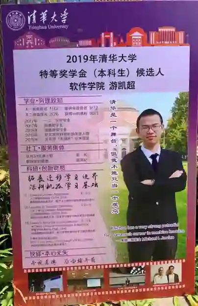 经过了坚定的努力,在过往的三年多中,游凯超共有 36 门课程成绩达到 4.0。此外,游凯超在本科生涯中获得了一二·九奖学金、蒋南翔奖学金、高通奖学金等多项奖学金,也曾获评软件学院科研科创年度人物。他的经历也正像本人所说的一样:「清华是一个舞台,但我不能只当一个观众。」
