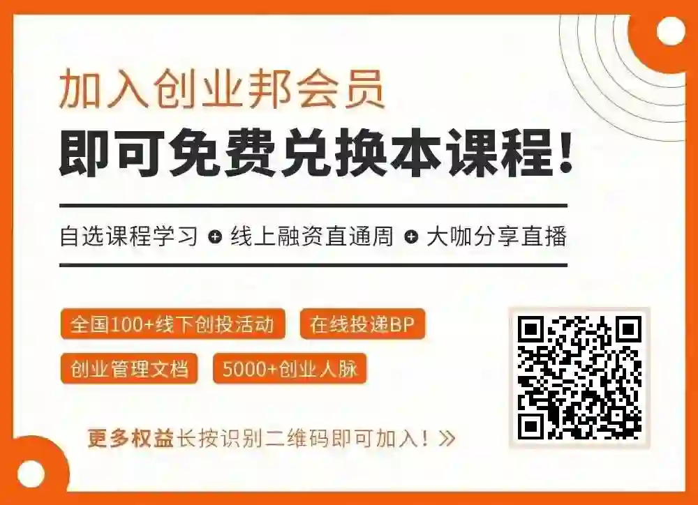 6000+创业人脉、行业、地区各个社群资源对接;创业必备文档大礼包、200+创业精品课任选8门、创业训练营、12+场直播讲座、会员花名册、需求看板发布;免费参加创业邦全年3次峰会及无限次参加全国12座城市线下所有活动!扫码即可加入!