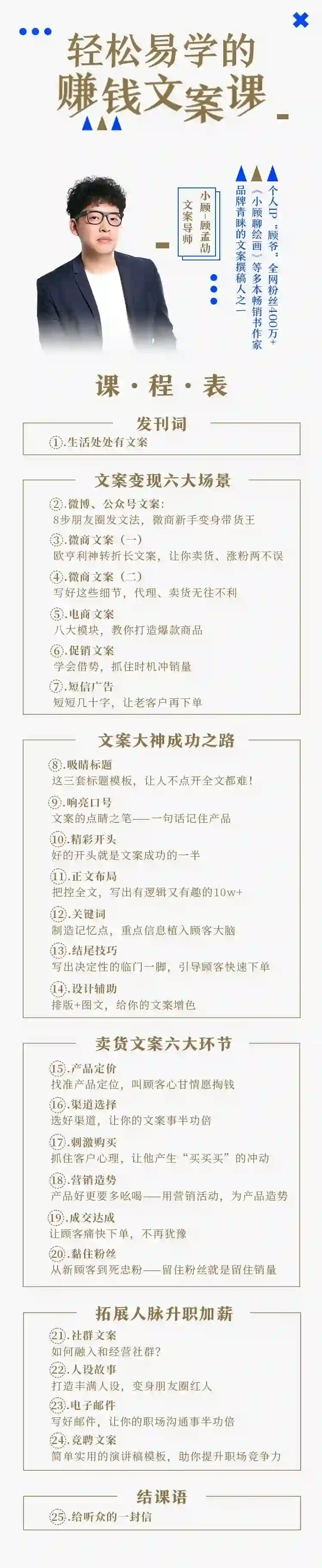 为了帮更多的人掌握文案技能,创业邦特邀顾爷录制了一堂25节的《轻松易学的赚钱文案课》,他将