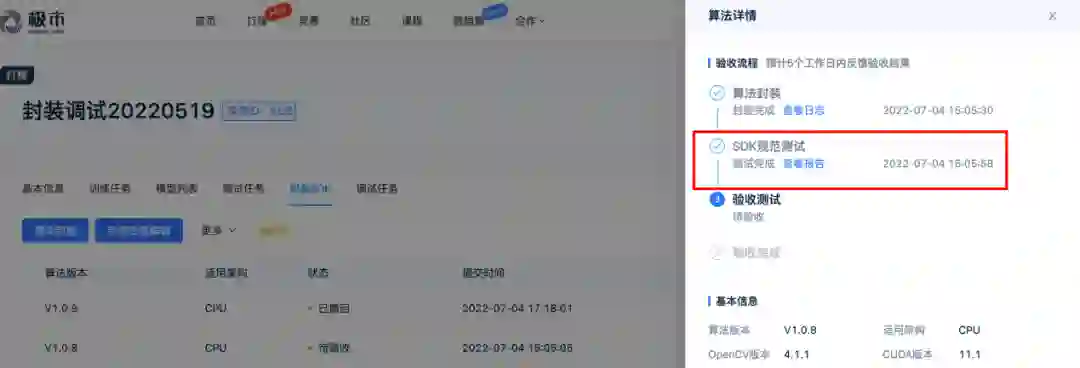而SDK封装有严格的规范要求,如果人工手动校验比较耗时,也容易遗漏细节。为此,极市平台推出了自动化SDK规范测试功能,校验内容包括工程路径是否存在、库文件是否正常加载、输入输出图片的尺寸是否一致、内存是否被释放等。整个校验过程平均只需60 秒以内!