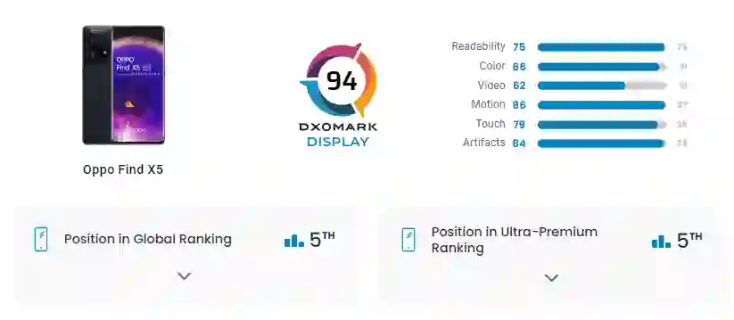 DxOMark 表示,OPPO Find X5 的屏幕有着出色的易读性,无论是在室内和还是弱光场景中,都具有良好的亮度,能够很好地适应环境光线的转变。在大多数情况下,屏幕触控非常流畅且准确。此外,这款设备的色彩和亮度均匀度也很不错。总体而言,OPPO Find X5 在大多数使用场景中都能为用户带来良好的阅读体验,整体表现优于前代产品 OPPO Find X3 Neo。