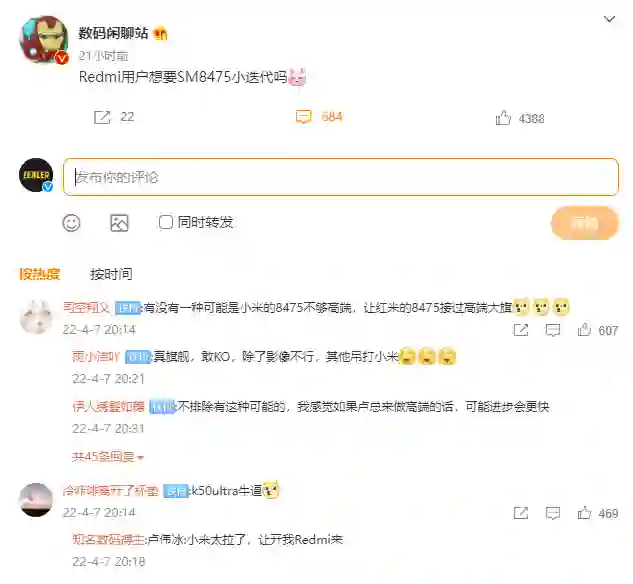 此外,据 @数码闲聊站 今日爆料,Redmi 有一款搭载高通骁龙 8 Plus 旗舰处理器的新机已在路上,评论区有网友猜测为 Redmi K50 Ultra。据之前报道,这次骁龙 8 Plus 可能依然会被摩托罗拉抢下首发,并且这款首发的新旗舰还将搭载 2 亿像素主摄,成为全球首款 2 亿像素旗舰,而且很长一段时间内可能也是唯一超高像素的机型。
