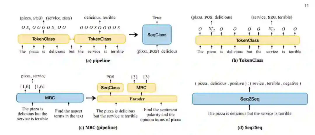 尽管情感元素具有一定的有效性和普及性,但仅找到一个单一的情感元素对于理解完整的aspect-level意见仍是远远不够的,这不仅需要提取多个情感元素,还需要认识到它们之间的对应关系和依赖性。为此,近年来引入了几个新的ABSA任务[10,11,12,7]以及相应的基准数据集,以促进多情感要素联合预测的研究。这些任务被称为复合ABSA任务,而不是只涉及单一情感因素的单一ABSA任务。例如,方面-观点对提取任务[11,13]要求以复合形式提取方面及其关联的意见词,即从前面的示例句子中提取(pizza, delicious)对。因此,它提供了一个更清晰的理解所提到的观点目标及其相关的观点表达是什么。在一些开创性的工作之后,人们提出了各种框架来处理不同的复合ABSA任务,以便在不同的场景中实现方面级的观点挖掘。然而,现有的调研缺乏对各种ABSA任务的系统综述,特别是复合ABSA任务的最新进展[1,5,14,6,15,16],我们希望通过本次综述来填补这一空白。