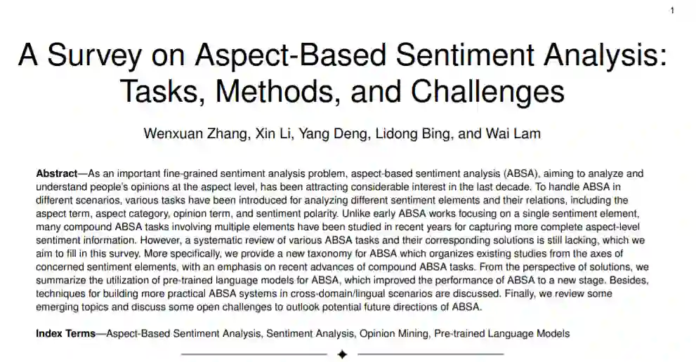 基于方面的情感分析(aspect-based sentiment analysis, ABSA)是一个重要的细粒度情感分析问题,旨在分析和理解人们在方面层面的观点,在过去的十年中受到了广泛的关注。在不同的场景中处理ABSA,引入了不同的任务来分析不同的情感元素及其关系,包括方面术语、方面类别、观点术语和情感极性。与早期的ABSA工作侧重于单个情感元素不同,近年来研究了许多包含多个元素的复合ABSA任务,以获取更完整的方面级情感信息。然而,我们仍然缺乏对各种ABSA任务及其相应解决方案的系统回顾,这正是我们本次综述的目的。更具体地说,我们为ABSA提供了一个新的分类方法,该方法将现有的研究从有关情感要素的轴心组织起来,并重点介绍了ABSA任务的最新进展。从解决方案的角度,我们总结了对预训练语言模型的应用,将ABSA的性能提高到一个新的阶段。此外,还讨论了在跨域/语言场景中构建更实用的ABSA系统的技术。最后,我们回顾了一些新兴的话题,并讨论了一些开放的挑战,展望了ABSA的潜在未来方向。