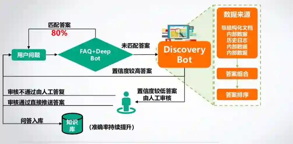 如下图所示 Discovery Bot 为例,Discovery Bot 主要解决未收录知识的问答。实际使用中,通常需要配合 FAQ 和 Deep Bot 等一起使用,用于解决 FAQ 和 Deep Bot 无法解答的问题,它会通过大规模企业内部知识(主要是非结构化文档)进行阅读理解并给出答案及置信度,根据置信度高低可分别向用户输出答案或经由人工确认或修改后再给出答案,同时可以将该条新知识加入到知识库中,以便下次遇到同样问题时可以通过 FAQ 或 Deep Bot 来解答。通过这一过程我们可以使系统的准确率得到持续地提升。
