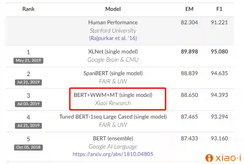 除此之外,在 2019 年 7 月,小 i 机器人研究院团队在由斯坦福大学发起的国际权威机器阅读理解评测 SQuAD1.1 挑战赛中,凭借最新研究成果——BERT+WWM+MT 的单模型,以 EM(精准匹配率) 达到 88.650 和 F1(模糊匹配率) 达到 94.303 超越人类平均水平的优异成绩排名第三。不同于排名第一第二的 Google、Facebook 联合学校参赛,小 i 机器人属于独立参赛。