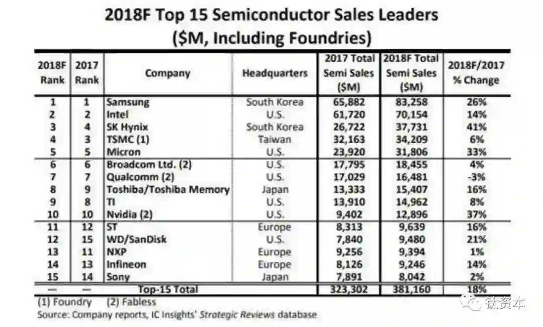 图2是2017年Fabless公司Top10榜单,十家公司中六家来自美国,一家来自新加坡,一家来自台湾地区,两家来自祖国大陆(华为的海思和清华下的嘉瑞集团),而欧洲和日本在榜单上都出局了。再考虑到博通把总部迁移到美国,那就意味着美国占了七家,比例非常惊人。其中比较看好的是海思,海思在2018年的营收将近74亿美金,之前有看法说如果海思的营收在2019年能保持20%的增幅,有可能超过图一中的NXP,不过在现在的形势下这个挑战的难度大大增加了。