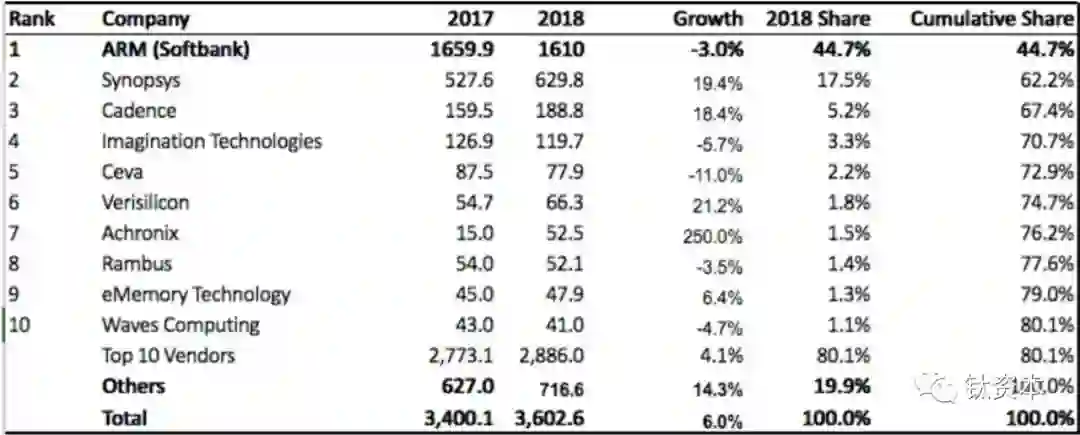 上图是IP公司的榜单。这些IP公司几乎全部来源于美国或受制于美国。排名第一的是ARM公司,原来是一家英国公司,后来被日本的软银集团收购了,但它也要受制与美国,所以所谓禁令出来后,很快就停止了与华为的合作。排名第二、第三的两家公司是EDA三巨头中的Synopsys、Cadence,都是美国公司。Ceva是一家以色列公司,虽然不是美国公司,但是美国的盟友。Imagination公司原来跟ARM一样是一家英国公司,在2017年被中国的资金完全收购了,所以目前在所有权上完全属于中国资金所有。同时技术也不来源于美国,因为在被中国国资收购前,把所有的美国技术全部剥离出去了,所以目前不用担心这家公司。
