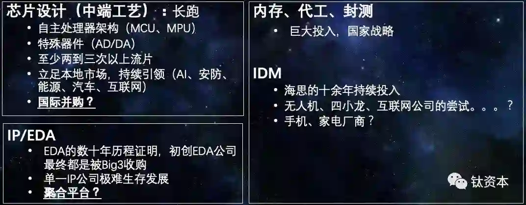 如果真的是两国博奕,要占领未来科技发展的制高点。若仅有设计公司,芯片设计的部分是完全不足以支撑的,像芯片的上游EDA、IP,还有芯片的代工、代工厂的上游,完全都在别人手里,想要把产业链重新连起来,里面相当多的环节都要重新开始自己建设,国内虽然也有EDA公司,就算不是重新开始也是从一个非常低的起点开始。