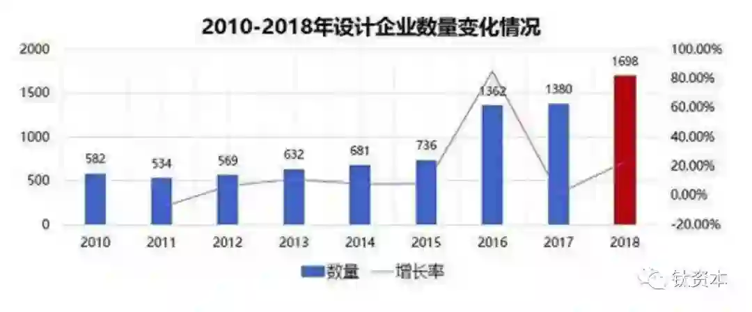 前面进行的很多分析可能有些偏悲观了,但是其实我们也不必过分悲观。之前的一段时间可以看到一个趋势,芯片产业在国内的发展非常明显,特别在2014年国家的“大基金”推出后,芯片设计公司的数量几乎翻了一番还多,大幅增长。
