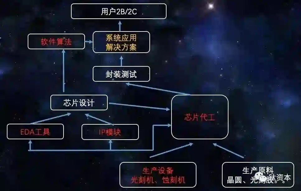 芯片代工厂的上游是TSMC以及国内的中芯国际。它们也有上游,比如光刻机90%以上由荷兰ASML提供。整个芯片生产线牵扯到的设备非常多,其中技术门槛最高的是光刻机,还有其他设备比如离子注入、蚀刻等等。除了设备之外,芯片代工还需要准备芯片生产过程中的耗材或原材料,比如所有的芯片最终都要做到晶圆上,包括每个工艺节点上要做光刻还需要有光刻胶等等原材料,都需要供应商。所以,芯片产业链条中的环节非常多,欠缺了任何一个环节,链条就会被打断,无法实现。