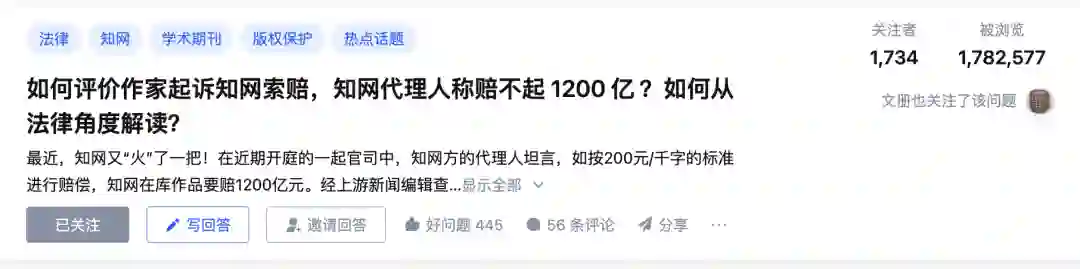 也许是因为知网最近声名在外,终于被监管局“注意”到。它出圈不是因为毕业季提及频率高,而是因为又一位作家起诉知网侵权,知网运营方表示,再这样下去真的要“赔不起了”,这可是1200亿!