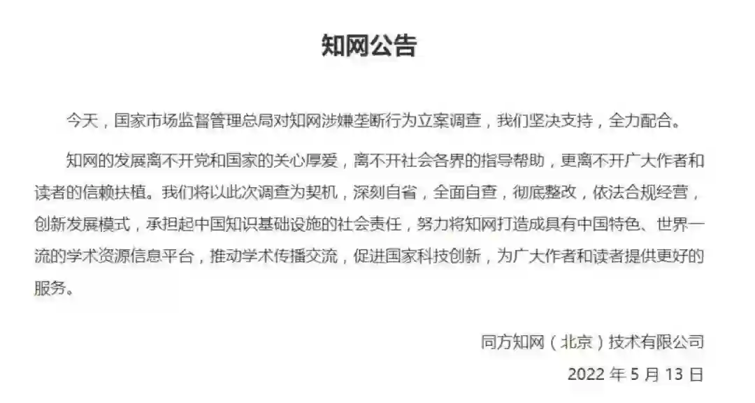 知网在5月13日下午做出回应声称“将以此次调查为契机,深刻自省,全面自查,彻底整改,依法合规经营,创新发展模式,承担起中国知识基础设施的社会责任。”