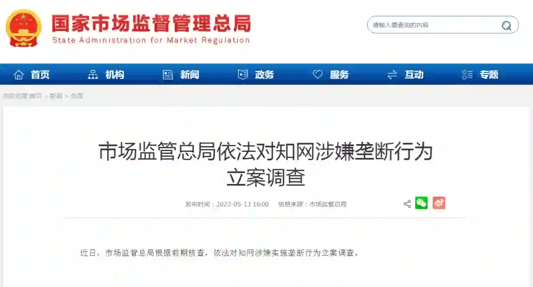 近日,市场监管总局根据前期核查,依法对知网涉嫌实施垄断行为立案调查。